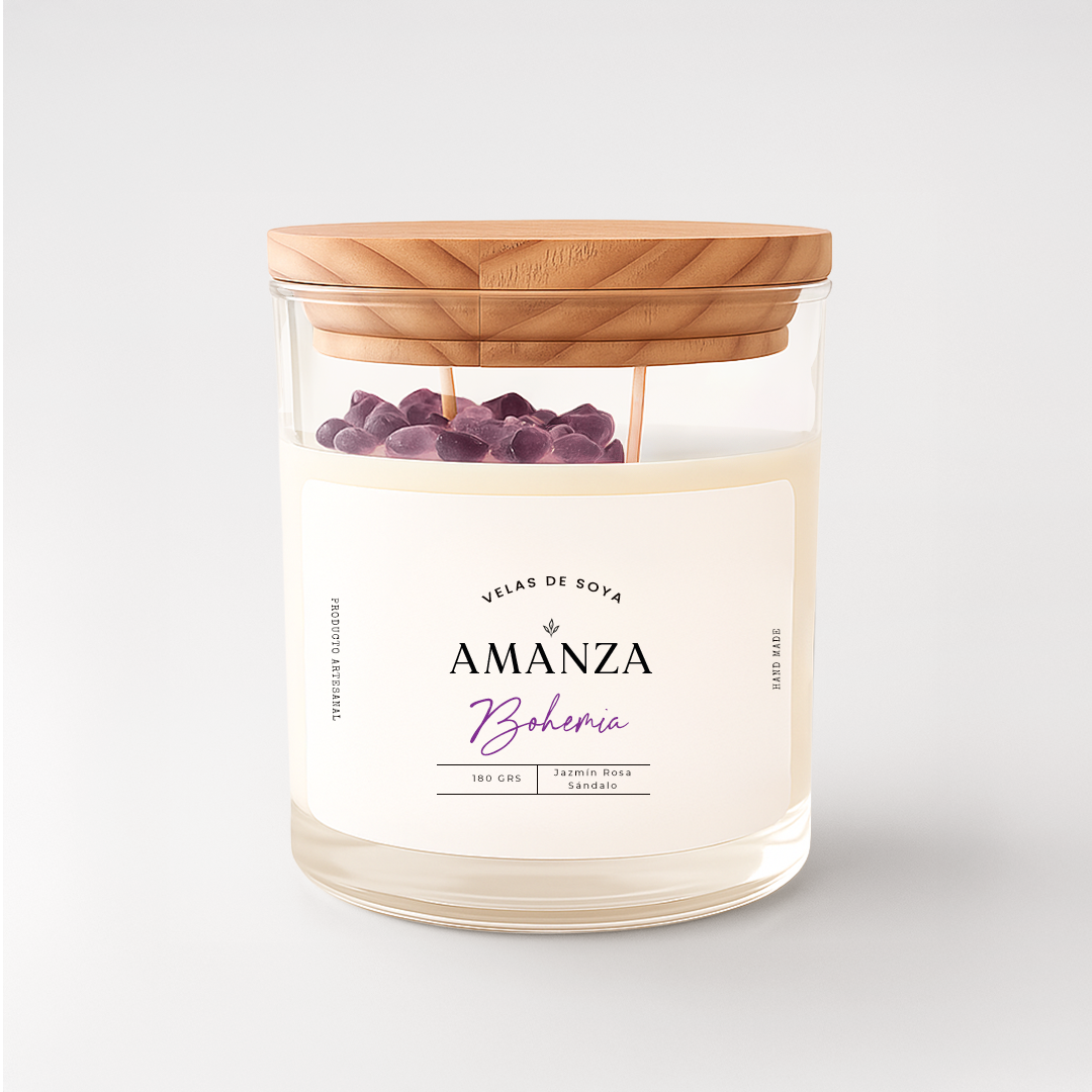 La vela Amanza Bohemia une la frescura del jazmín, la suavidad de la rosa y la profundidad del sándalo, logrando un aroma envolvente que transmite calma y elegancia.